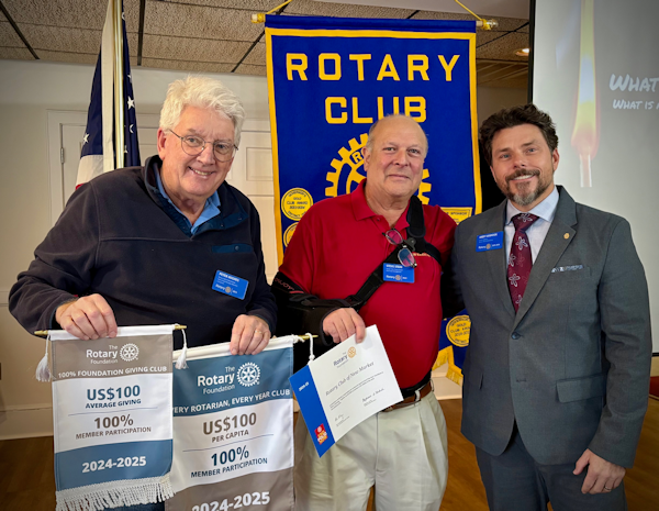 Past president Peter Hughes (left) and current president Steve Stein (center) are presented with banners acknowledging 100% member participation in the Rotary Foundation by District Governor Rotary District 7570 Andy Vanhook .
