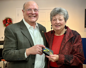 New Market Rotary President, Steve Stein, presents a Paul Harris Fellow award to Pat Fuchs at the annual Christmas Party held at Shenvalee Golf Course on December 13, 2025